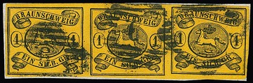 1 Sgr. schw./braungelb mit extremer, herstellungsbedingter Quetschfalte, in Mischfrankatur mit 4/4 Ggr. schw./braun, je Kabinettstücke auf doppelt verwendeter Inlands-Briefvs. der 3. Gewichtsstufe von Braunschweig 1860 nach Vechelde. Seltene Währungs-Mischfrankatur (mit 3 Pfg. vorausbezahltem Bestellgeld). Attest Lange