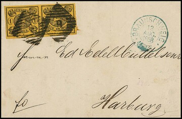 1 Sgr. schw./braungelb im Paar auf Kabinettbrief mit NS "9" und K2 "Braunschweig" 1858 nach Harburg, Fotoexp. Wilderbeek