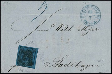 2 Sgr. schw./blau, aussergewöhnlich breit- bis weit überrandiges Luxusstück mit Teilen von drei Nebenmarken auf Brief von Braunschweig nach Stadthagen, sign. A. und E. Diena, Bolaffi