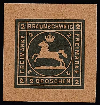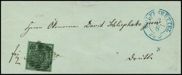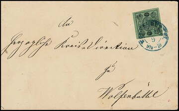 1/2 Gr. schw./grün, breitrandiges Kabinettstück einzeln auf Ortsbrief (seitlich fehlt ein Klappenteil, belanglos) mit K2 "Wolfenbüttel". Sign. Rühland, Szekula und Attest Eichele. Mi. 1500,-