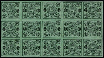 1/2 Gr. schw./grün im ungebrauchten 15er-Block, einige Marken auch postfrisch. Eine Marke kl. helle Stelle, typische Vorfaltspuren, seltene Einheit (Mi. für drei Viererstreifen schon 660,-)