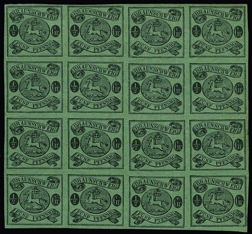 1/2 Gr. schw./grün, dünnes Papier, postfrischer Kabinett-16er-Block, sign. Engel und Attest Lange "einwandfrei". Mi. für vier Viererblöcke 1600,- +