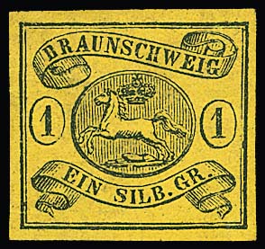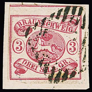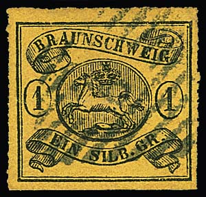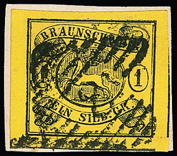 1 Sgr. schw./gelb, linienförmiger Versuchsdurchstich "17", zentrisch gestempelt mit NS "8" (Braunschweig), unten Scherentrennung sowie winzige Papierlasche (im Attest Lange nicht bemängelt). Sign. Pfenninger, Decker und Attest Lange, die hervorhebt, dass die Scherentrennung bei dieser Durchstichart typisch war, so dass diese nicht in "Serie" ging. Mi. 7000,-