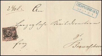 3 Sgr. schw./dunkelrosa, Kabinettstück auf Inlandsbrief der 3. Gewichtsstufe (min. Randriß) mit NS "42" und blauem Ra2 "Thedinghausen" nach Braunschweig. Späte Verwendung der Nr. 8 in 1863, mit dieser Marke als Inlandsverwendung möglicherweise Unikat. Sign. Engel und Attest Wilderbeek