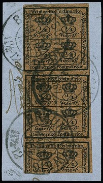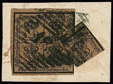 5/4 Ggr. schw./gelbbraun, kopfstehendes Wasserzeichen, geklebt zu 4/4 und 1/4 (einseitig berührt) auf Briefstück mit NS "18" (Halle a.d. Weser), Attest Lange. Mi. 3250,-