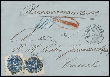 2 Gr. blau per zwei (teils Scherentrennung) auf Reco-Brief von Braunschweig (NS "8" und Neben-K2) 1866 nach Cassel