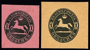 1 Gr. schwarz, zwei Probedrucke von 1865, "großes Pferd mit Krone", auf rosa und auf sämischem Kartonpapier