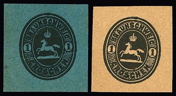 1 Gr. schwarz auf blauem (Bugspur) und sämischem Karton, zwei Probedrucke von 1865, "kleines Pferd mit Krone im Queroval" in endgültiger Zeichnung