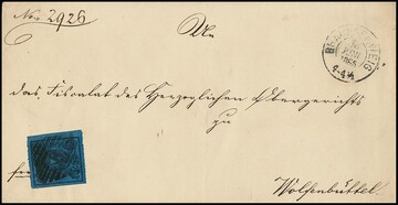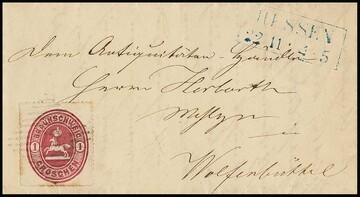 2 Sgr. schw./blau, unten Scherentrennung, oben kleiner Rand, auf Brief aus Braunschweig (NS "8") 1865, Mi. 1200,-
