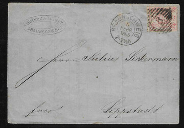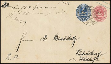 2 Gr. blau, Prachtstück auf Ganzsache 1 Gr. rosa (diese leichte Gebrauchsspuren und Adresse überschrieben) mit K2 "Braunschweig" 1866