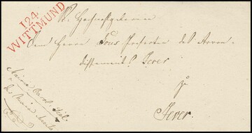 "Wittmund", 1811/(1811), roter L2 "124 WITTMUND" sehr klar auf sauberem Brief mit hs. Franchise von Carolinensyhl, sowie in schwarz auf Brief mit Inhalt aus Etzel. Feuser 3955-1, 360,-