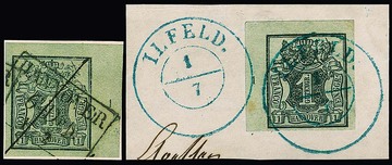 1 Ggr. schw./graugrün auf Luxusbriefstück mit blauem L1 "Lehe", Ra2 nebengesetzt, sign. Krause, dazu loses Luxus-Unterrandstück mit gleichem Stempel,ex Slg. Erivan Haub