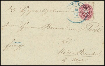 1 Gr. rosa im waagerechten Fünferstreifen aus der rechten unteren Bogenecke, rechts mit Reihenzahl "12", auf Ganzsachenumschlag 1 Gr. rosa mit klaren, blauen K2 "Schladen" nach Kurland mit Leitvermerk "über Berlin und Memel". Trotz Mängel (Streifen oben Scherentrennung und Papierverletzung durch Falte) ein wohl einmaliger Brief mit dieser Darstellung des 6 Gr.-Rußland-Portos