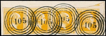 3 Sgr. orangegelb, seltener Viererstreifen vom rechten Bogenrand auf Briefstück mit NS "105" (Berlin Bahnpost), linke Marke gut, sonst unten berührt und unauffällige Einschnitte, oben mit Nebenmarken-Ansatz und Klischee-Verschiebung von der Mitte der 50er-Druck-Blöcke, Mi. "-.-"