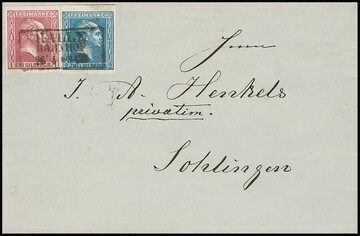 2 Sgr. blau mit Plattenfehler "Schnupfnase", nebst 1 Sgr. rosa, auf Kabinettbrief mit geradem Ra3 "Halle Bahnhof" nach Solingen, sign. Flemming, Banker. Mi. 350,-