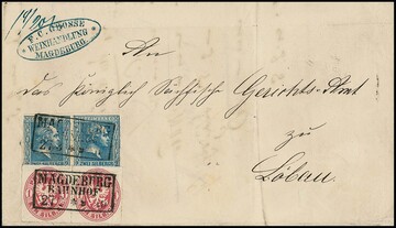 2 Sgr. dunkelblau im Paar (linke Marke links etwas berührt) in Mischfrankatur mit Paar Wappen 1 Sgr. rosa auf gef. Postvereinsbrief der 2. Gewichtsstufe mit klaren Ra3 "Magdeburg Bahnhof" nach Löbau 1862, sign. Brettl, ungewöhnliche Kombination!
