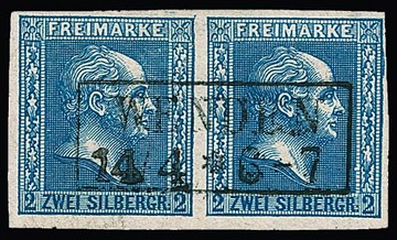 2 Sgr. blau, Kabinettpaar mit idealem Ra2 "Wenden", linke Marke Plattenfehler III ("Schmiss") von einem neuen Bogenfeld des späten, neuen Druckplatten-Aufbaus, ex Slg. Erivan Haub