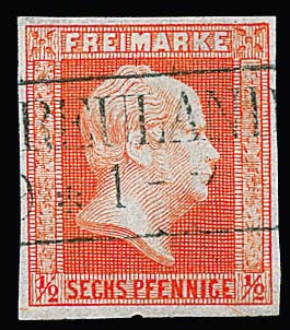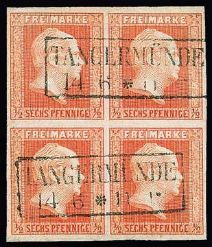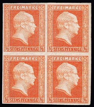 1/2 Sgr. ziegelrot, ungebrauchter Kabinett-Viererblock, breite Ränder und schöne Farbe. Sign. Kruschel. Mi. 2800,-, registriert seit der 8. Stock-Auktion 1920, danach u.a. Slg. Tomasini (Kruschel 1981, Zuschlag DM 5000,-). Es dürften maximal fünf ungebrauchte Viererblöcke dieser Marke existieren, ex Slg. Erivan Haub
