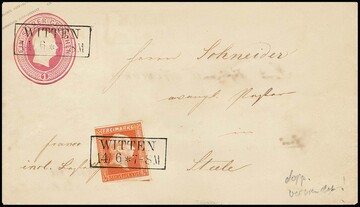 1/2 Sgr. ziegelrot, perfektes Exemplar als Bestellgeld auf Kopf-Ganzsache 1 Sgr. rosa, mit Ra2 "Witten" nach Steele b. Essen, Couvert (entsprechende Gebrauchs- und Altersspuren) gewendet und von Steele (Ra2) als Portobrief nach Rheda weitergesandt, sign. Banker