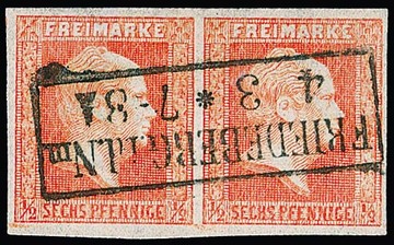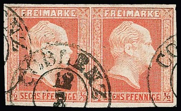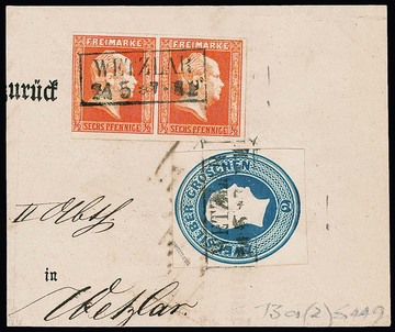 1/2 Sgr. ziegelrot im Paar (linke Marke links berührt) in guter Kombination mit breitrandigem viereckigem Kopf-Ganzsachen-Ausschnitt 2 Sgr. blau (Kabinett) auf großem Abschnitt von Post-Ins.-Doc. mit Ra2 "Wetzlar", sign. Flemming, Banker