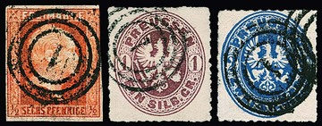 1/2 Sgr. ziegelrot (oben rechts min. Randlinienschnitt, auf dieser Marke sehr selten!), sowie Wappen 1 Sgr. rosa und 2 Sgr. blau (sign. Flemming), je mit seltener Fremdentwertung durch dänischen NS "1" von Kopenhagen