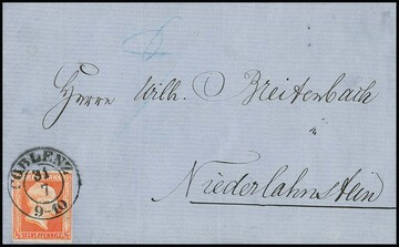 1/2 Sgr. bräunlichrot (kl. Spalt) einzeln auf Brief mit K2 "Coblenz" zum moderierten Sonderporto ins taxische Niederlahnstein, ex Metzer, sign. Meier. Mi. 1500,- +, ex Slg. Erivan Haub