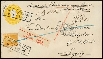 3 Sgr. orange mit enormem 16mm breitem Bogenrand links, Reihenzahl "2" (Unterrand angesetzt) auf wertgleicher Ganzsache 3 Sgr. gelborange, mit Ra2 "Greifswald" als Paketbegleitbrief nach Leipzig. Attest Wasels, ex Slg. Erivan Haub