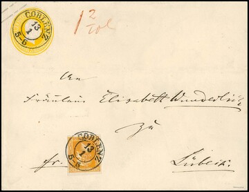 3 Sgr. orange auf Ganzsache 3 Sgr. gelborange im Großformat, mit K2 "Coblenz" als Doppelbrief nach Lübeck. Leichte Mittelfalte ausserhalb bzw. Reinigungsspuren, gut sign. Pfenninger und Attest Jäschke-L., ungewönliche Destination, ex Slg. Erivan Haub