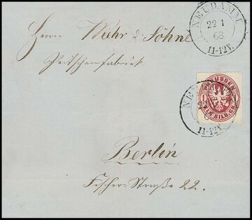 1 Sgr. rosa, tadellos auf Faltbrief mit K2 "Neudamm" vom 22.1.1868. Obwohl nicht mehr frankaturgültig, anstandslos ohne Nachtaxe befördert. Attest Jäschke-L., sign. Metzer, ex Slg. Erivan Haub