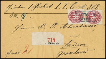 1 Sgr. rosa, perfektes Paar auf blauem Paketbegleitbrief (dieser geringe Reinigungsspuren) mit violettem Versuchs-Ra3 "Berlin Post-Exp. 7" vom 6.2.1867. Dieser violette Stempel war nur vom 30.1. bis 8.2.1867 in Gebrauch. Die etwa eine handvoll bekannten Belege mit diesem Stempel sind Paketbegleitbriefe der Firma Reihlen & Söhne, Stuttgart, die die schlauen Schwaben zwecks Portoersparnis in Berlin auflieferten. Die anderen Paketbriefe dieses Absenders tragen eine 4-Sgr.-Frankatur, so auch Los 895 der 224. Rauhut & Kruschel-Auktion. Das vorliegende Stück stammt aus den Sammlungen Anderegg, John Gunn (13. Erhardt + Feuser 1985) und Kuphal (Kruschel 1994), bei uns registriert seit der 17. Müller-Auktion in Basel 1958. Sign. Kruschel und Attest Jäschke-L., ex Slg. Erivan Haub