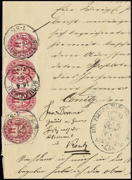 1 Sgr. rosa per vier (einmal kleine Fehler) in sehr seltener Verwendung auf dem Post-Insinuations-Dokument mit K2 "Schlochau", normalerweise waren die Marken aussen zu frankieren, in dieser Form keine handvoll Belege bekannt! Sign. Banker