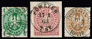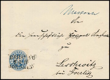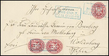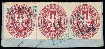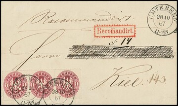 1 Sgr. dunkelrosa, prachtvoller Dreierstreifen auf Recobrief (dieser mit Gebrauchsspuren, ein seitliches Klappenteil fehlt und Adreßname überschrieben) mit Schleswig-Holstein-K2 "Uetersen" vom 28.10.67 nach Kiel. Als Ergebnis des 1866er Krieges wurden die Herzogtümer Schleswig und Holstein zum 1.1.1867 preußische Provinz, die eigenen Marken behielten jedoch ihre Gültigkeit bis zum Ende der preußischen Post zum 31.12.1867. Preußische Marken waren zwar ab dem 2. Februar 1867 in Schleswig-Holstein frankaturgültig, wurden aber - mit Ausnahme der Lieferung von 3 Sgr.-Werten an vereinzelte Postämter (lt. Krötzsch-Handbuch) - nicht an den dortigen Postschaltern verkauft und mussten somit von aussen eingeführt werden. Reine preußische Frankaturen sind daher größte Seltenheiten, zumal aus einem kleineren Ort. Es handelt sich hier nach dem "Gerwischkehmen"-Brief um das teuerste und wertvollste Stück (DM 29.000,-) aus der Slg. von Prof. Brühl (Mohrmann 1986, danach ex Slg. Müller) und um ein Unikat. Sign. Schmitt und Attest Jäschke-L.,ex Slg. Erivan Haub, Foto siehe Katalog-Rückseite
