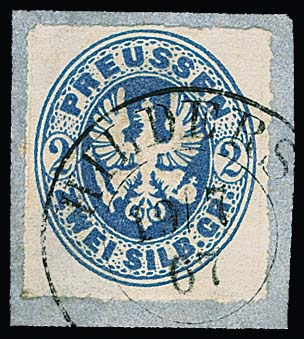 1 Sgr. rosa, Kabinettstück auf frischer Kopf-Ganzsache 2 Sgr. blau (rs. unbed. Siegel-Ausschnitt) mit K2 "Stralsund"