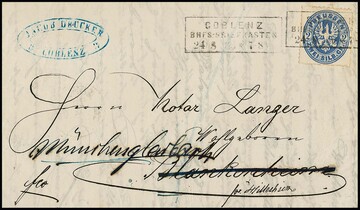 2 Sgr. blau, unbed. Randtönung, auf prachtvollem Nachsendebrief mit seltenem Grotesk-Ra3 "Coblenz Bhfs.-Briefkasten", ex Slg. Erivan Haub