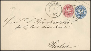 1 Sgr. rosa auf Ganzsache 2 Sgr. blau, mit besserem K2 "Cranz" in der Sondertype mit unten offenem Innenkreis nach Berlin, ferner 1 Sgr. rosa per zwei auf Ganzsache 1 Sgr. mit Ra2 "Birnbaum", beide ex Metzer, ex Slg. Erivan Haub