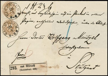 3 Sgr. ockerbraun, zwei Exemplare auf Paketbegleitbrief (Dreiviertelbogen), mit nachverw. Taxis-K1 "Eisenach" und Ortspaketzettel nach Stuttgart, kl. Mgl.