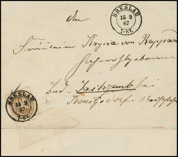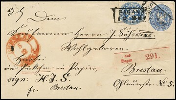 2 Sgr. blau in seltener wertgleicher Mischfrankatur mit breit viereckig geschnittenem Wappen-Ganzsachen-Ausschnitt 2 Sgr. ultramarin auf Kabinett-Paketbegleitbrief mit Ra2 "Sagan" nach Breslau, sign. Kruschel, Krause, Banker. Mi. 900,- +