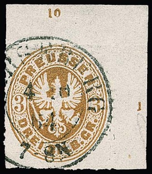 3 Sgr. ockerbraun, von der Wappen-Ausgabe seltene gestempelte rechte obere Bogenecke mit Reihenzahlen "10" bzw "1", oben Bugspur und leichte Reinigung, zentrischer K2 "Merseburg", Attest Jäschke-L. sowie sign. Kruschel, Ebel, ex Baldus (109. Grobe-Auktion 1957), ex Slg. Erivan Haub