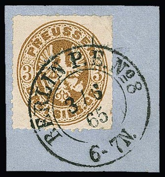 3 Sgr. ockerbraun, perfektes Exemplar mit 20mm breitem unterem Bogenrand, dort Platten-Nr. "2", auf Couvert mit K2 "Breslau", der Rand mit der Plattennummer war um den Briefrand geklebt und ist durch die Couvert-Öffnung jetzt gut sichtbar. Es handelt sich um den einzig bekannten Brief mit einer Plattennummer der Wappen-Ausgabe, wobei anzumerken ist, dass m.W. noch nicht einmal eine lose gestempelte Wappen-Plattennummer existiert. Aus der Slg. John Gunn (von diesem erworben 14. Erhardt + Feuser 1985), sign. Till Neumann und neues Attest Wasels, ex Slg. Erivan Haub