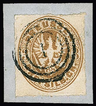 3 Sgr. ockerbraun auf Unterlage mit seltener Entwertung durch Schleswig-Holstein-Bahnpost-L3 "Kiel-Altona", ex Slg. Erivan Haub
