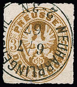 3 Sgr. ockerbraun, Kabinettstück (winziger Stempelfleck) mit ideal zentrischem K2 "Düsseldorf" in belgischer Versuchs-Type, ex Slg. Erivan Haub