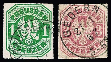 Acht Kreuzer-Werte in sehr unterschiedlicher Erhaltung mit seltenen neuen preußischen Grotesk-K1: Gedern, Gensingen, Hoehr, Hofheim, Krauchenwies, Merxheim, Montabaur und Pfiffligheim. Feuser 3550 P.