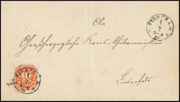 2 Kr. rotorange, Kabinettstück als Einzelfrankatur auf gefaltetem Brief mit sauberem Ersttagsstempel, Taxis-K1 "Fuerth i.O. 1/7 1867", nach Lindenfels. Ersttagsbriefe der Kreuzer-Ausgabe sind selten und nur in einigen wenigen Exemplaren erhalten geblieben, insbesondere von der teuren 2 Kr., Fotoattest Wasels