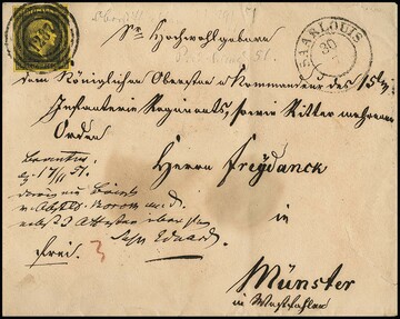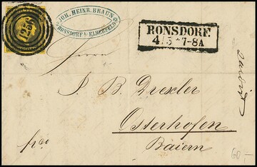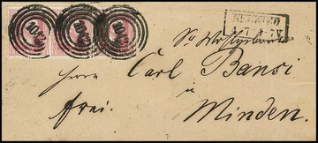 "1272" nebst Ra2 "Ruhrort" auf drei Briefen, dabei Prachtbrief 1 Sgr. schw./lilarosa, sowie bessere Kombination Nr. 2 mit 6a (diese unten angeschnitten)