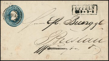 "1096" nebst Ra2 "Oppeln" (v. 27.9.51) als seltene Entwertung auf Kopf-Ganzsache 2 Sgr. (Gebrauchserhaltung, Adreßname überschrieben)