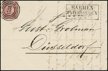 "1534" nebst Ra2 "Unterbarmen", bzw. Ra3 "Barmen-Unterbarmen", auf Briefvs. mit besserer Kombination 2 Sgr. schw./blau und 1 Sgr. rosa, bzw. Brief 1 Sgr., kl. Mgl.
