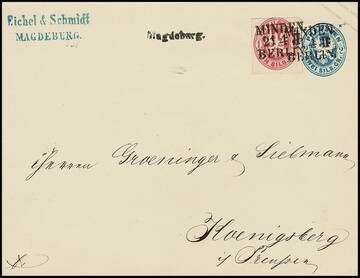 "Magdeburg", der Stations-L1 einmal nebengesetzt, einmal zusätzlich als Markenentwertung, auf zwei großformatigen Ganzsachen 2 Sgr. blau bzw. preußischblau, je mit Zusatzfrankatur 1 Sgr. rosa und Zug-L3 "Minden-Berlin", beide aus gleicher Korrespondenz