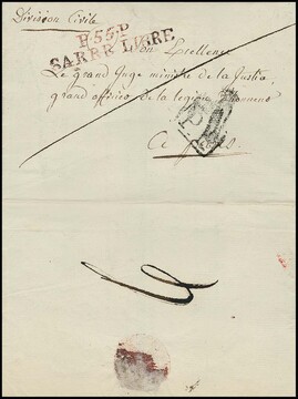 "Saarlouis", 1807, roter L2 "P.55.P. SARRE LIBRE" nebst schwarzem Ra1 "P.P." auf Brief an den Innenminister in Paris, hs. "Division Civile", Inhalt aus Voelklingen, Feuser 3064-10/500,-