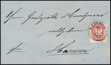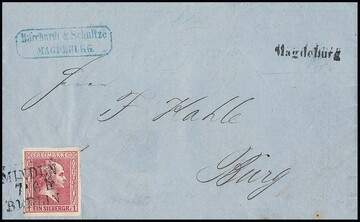 "Magdeburg", seltener Stations-Neben-L1, Marke mit Zug-L3 "Minden-Berlin" entwertet, auf Faltbrief mit Prachtstück 1 Sgr. karmin (Plattenfehler "SICBER"!)