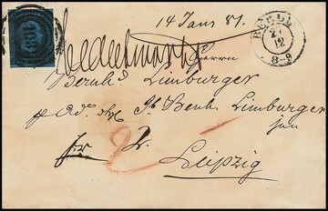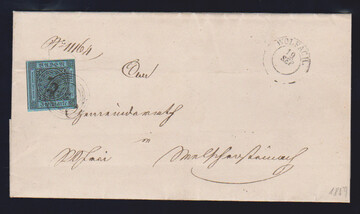 "ST. BAHNHOF BERLIN", L3 des Stettiner Bahnhofes klar auf Brief mit Inhalt, 11.12.1845, nach Stargardt. Es sind nur wenige Belegstücke dieses Stempels (vom 7.2.1844 bis 11.12.1845 in Gebrauch) bekannt, vorliegend zum einen besonders klarer Abschlag, dann noch auf einem Brief mit Inhalt (!), sowie der spätest bekannte Abschlag dieses Stempels (KHBW "Lp."). Ex John Gunn, ex Kuphal (Kruschel 1994 "Luxusbrief ... das schönste Stück dieser allerersten Toprarität"). Dopp. sign. Kruschel, ex Slg. Erivan Haub
